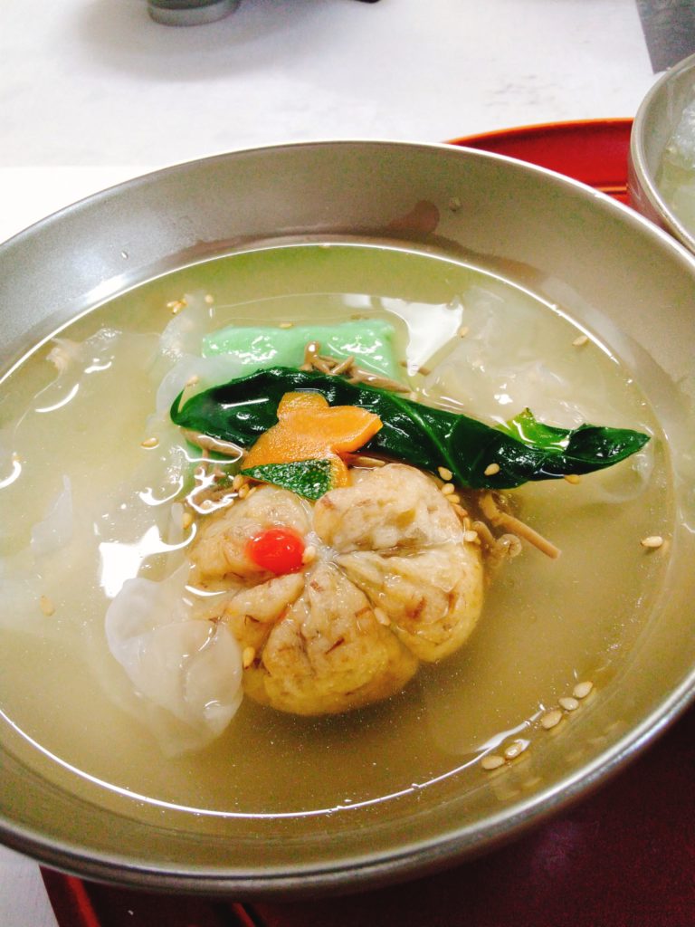 お椀 蟹豆腐、胡麻豆腐、舞茸、梅人参、イチョウ生麩、柚