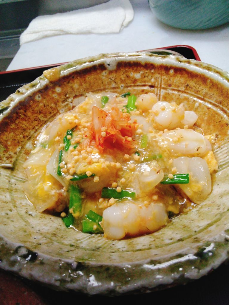 トウモロコシご飯に、海老、玉子、玉葱の餡掛け